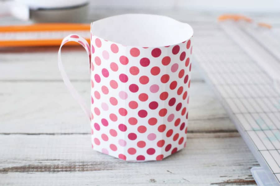 Create a mug shape by rolling up the paper to create a cylinder. Use hot glue on the edge to glue it together.