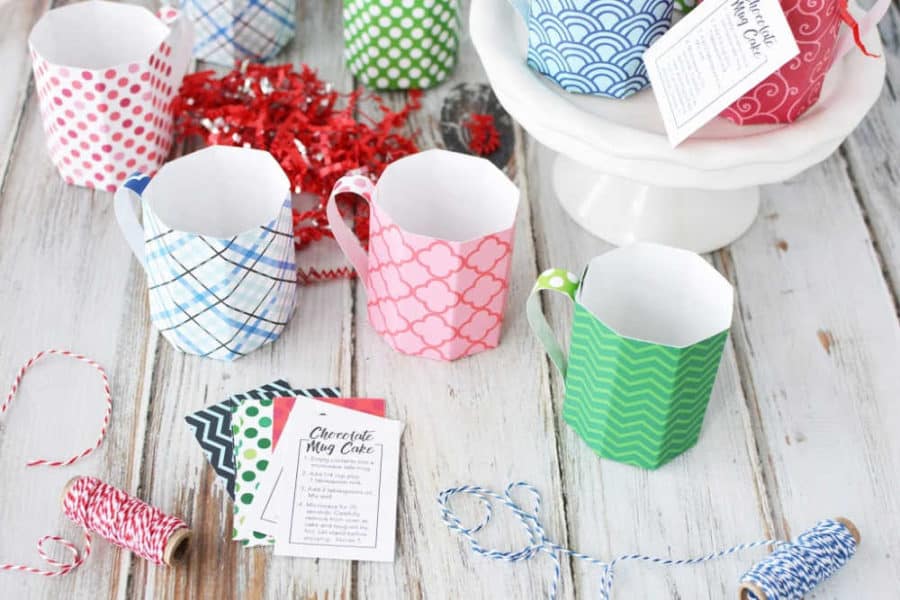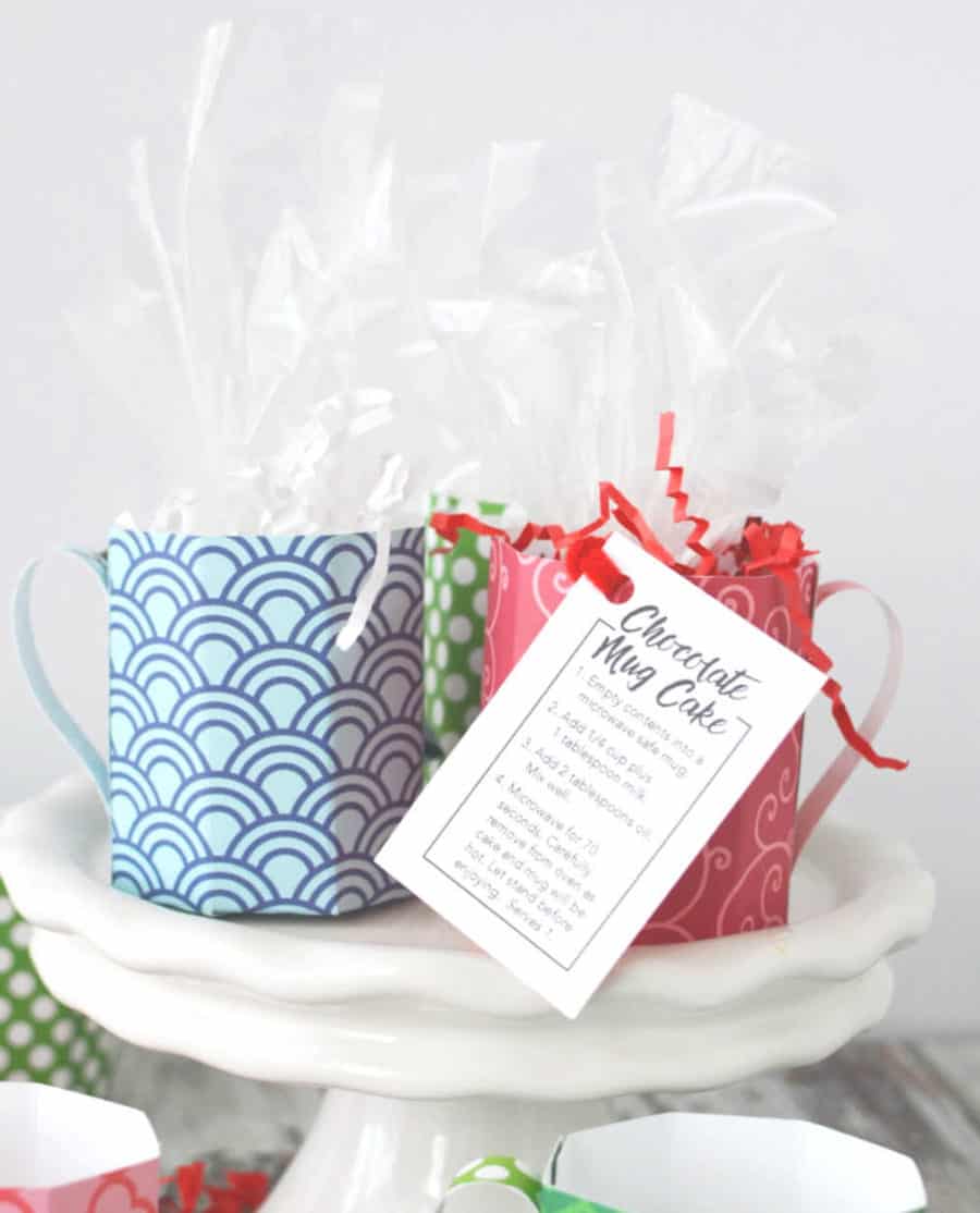Homemade mug cake mix is packaged in individual servings and put in an adorable DIY paper mug to give as a gift. Your recipients can then make the cakes in their own ceramic mugs.