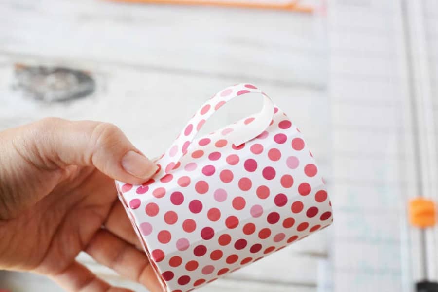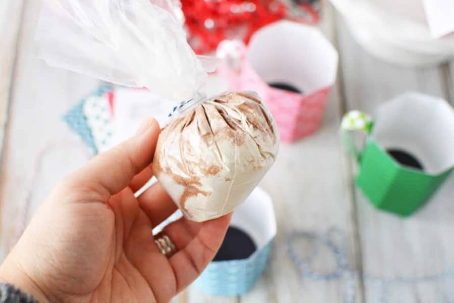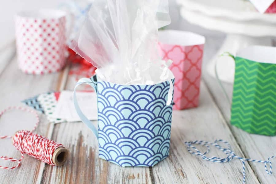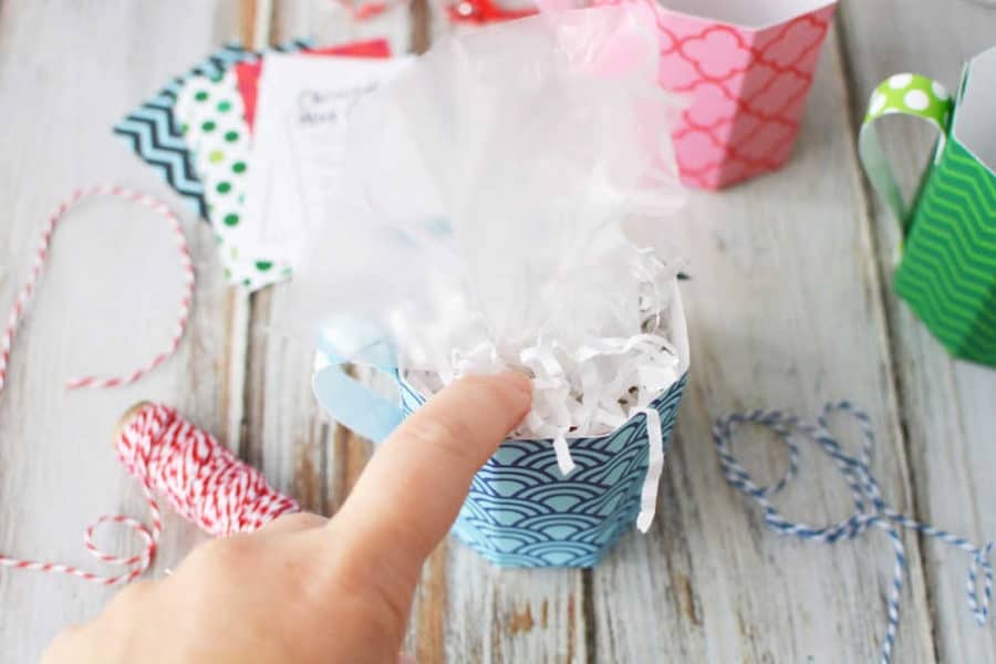 Tuck in some paper shredding or tissue paper so the cake mix fits snugly inside the paper mug. You don’t want it to fall out!