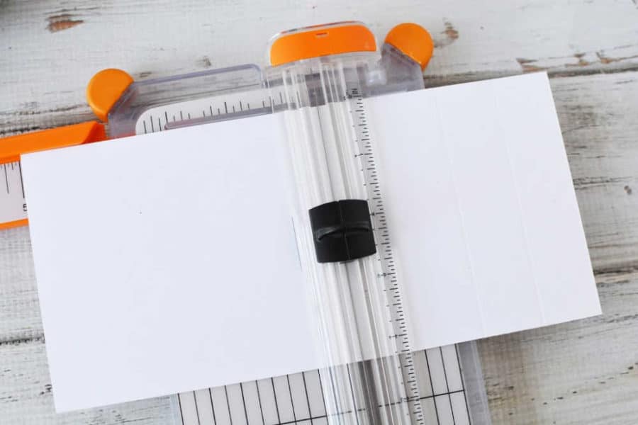 - Cut 1 sheet of card stock in half to 4.25" x 9" with a paper trimmer. Set aside the scrap pieces to use for the handle.