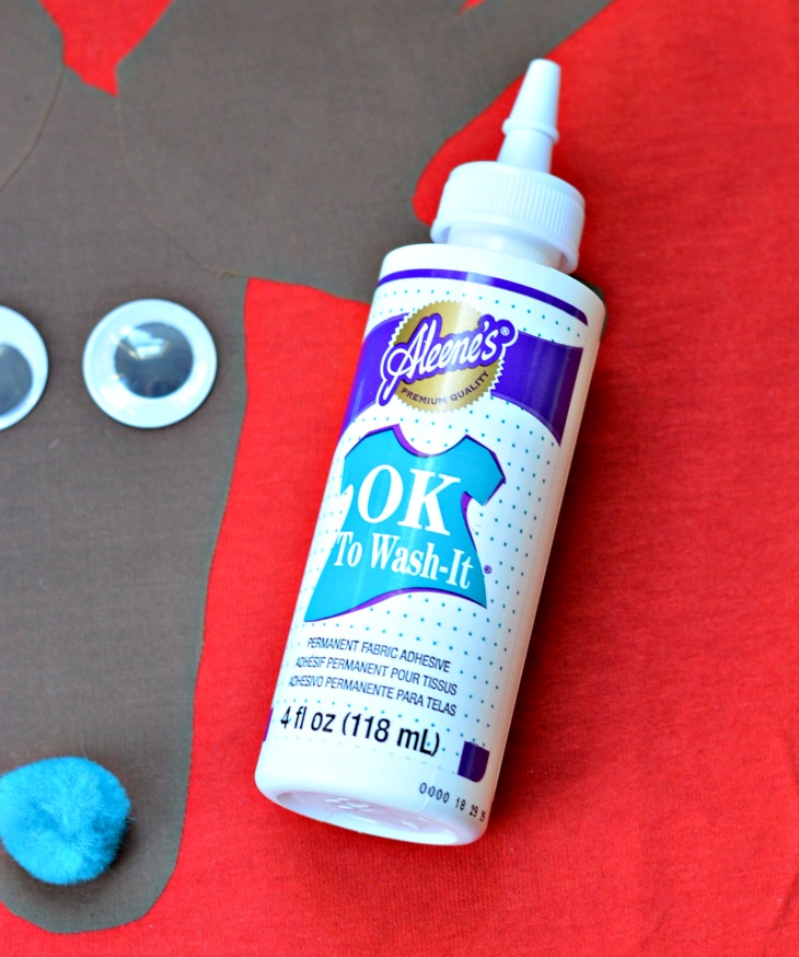 Now you are ready for the nose and the eyes. The first time I made these shirts, I sewed on buttons. But this time I used googly eyes and pom-poms from the dollar store. I glued them on with Aleene’s OK to Wash glue thinking that would work to wash the shirt. But my 8 year old pointed out that the pom poms may not wash very well. So you might want to stick with buttons – I’ll let you know.