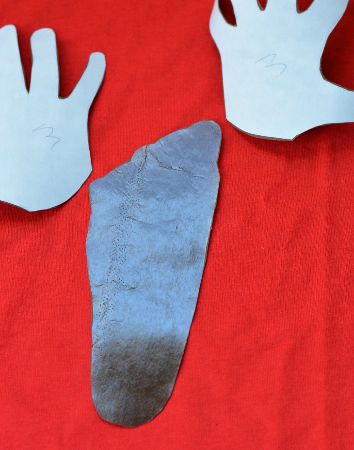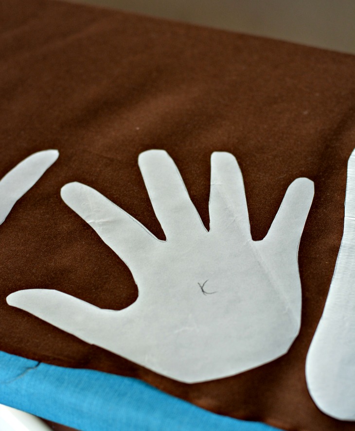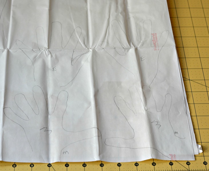 Trace both hands of each kid and one foot on to the back of the Heat N Bond. Cut out the hand and foot prints. This is the most time consuming step of the entire process!
