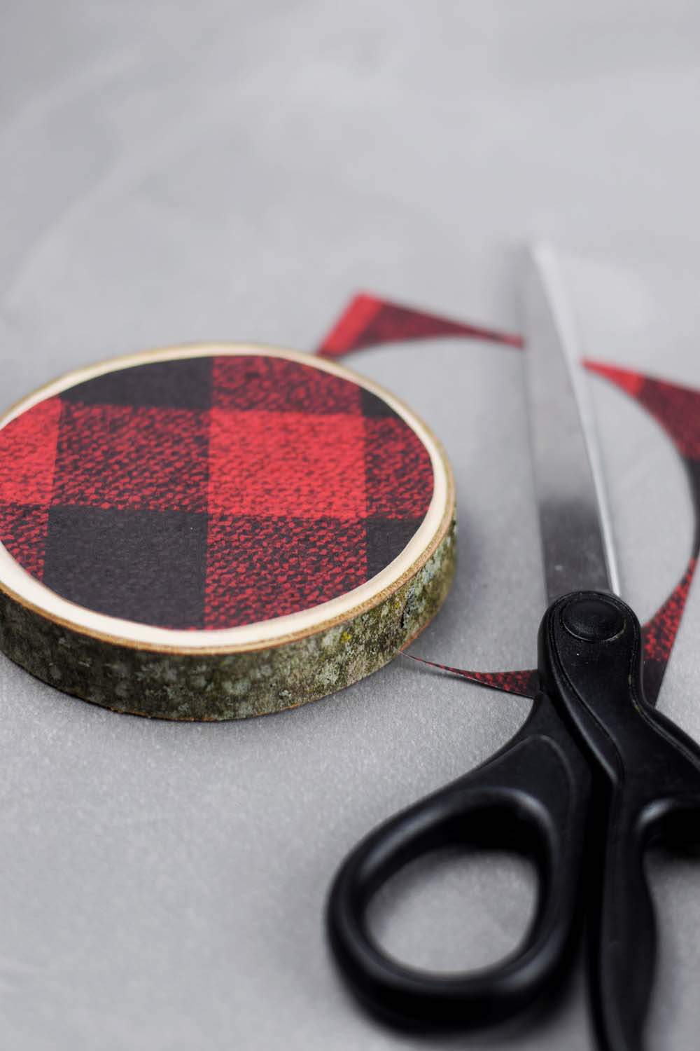 Start by cutting a circle out of the scrapbook sheet slightly smaller than the shape of your wood slice. You want a slight border of wood to be showing. Each wood slice will be a different size, so do each one individually.