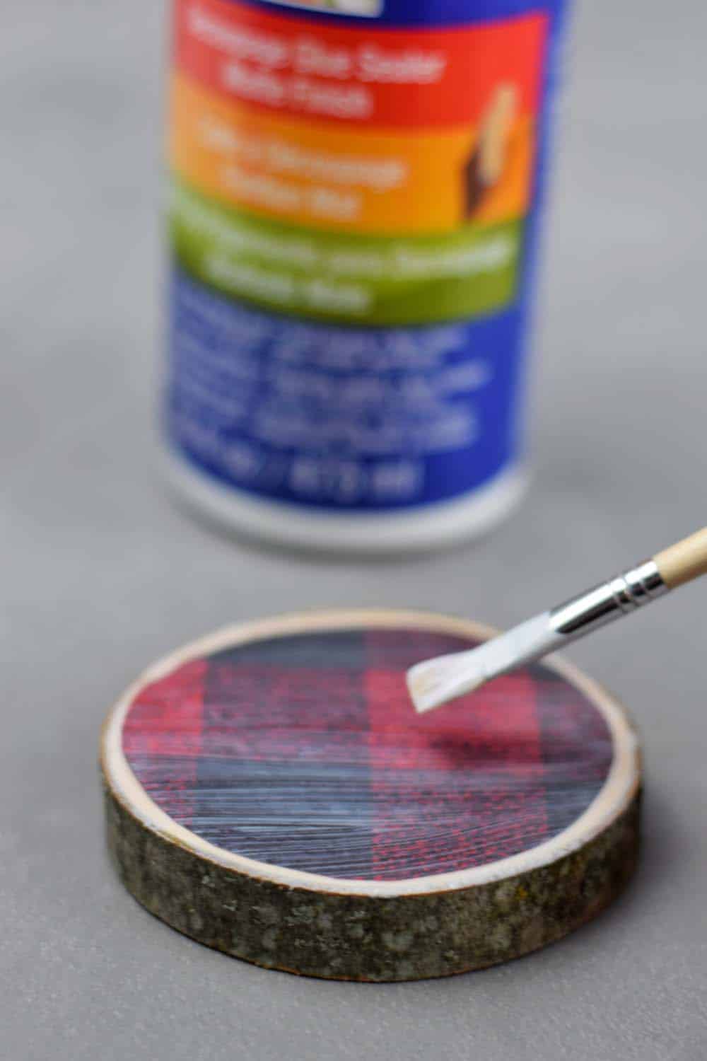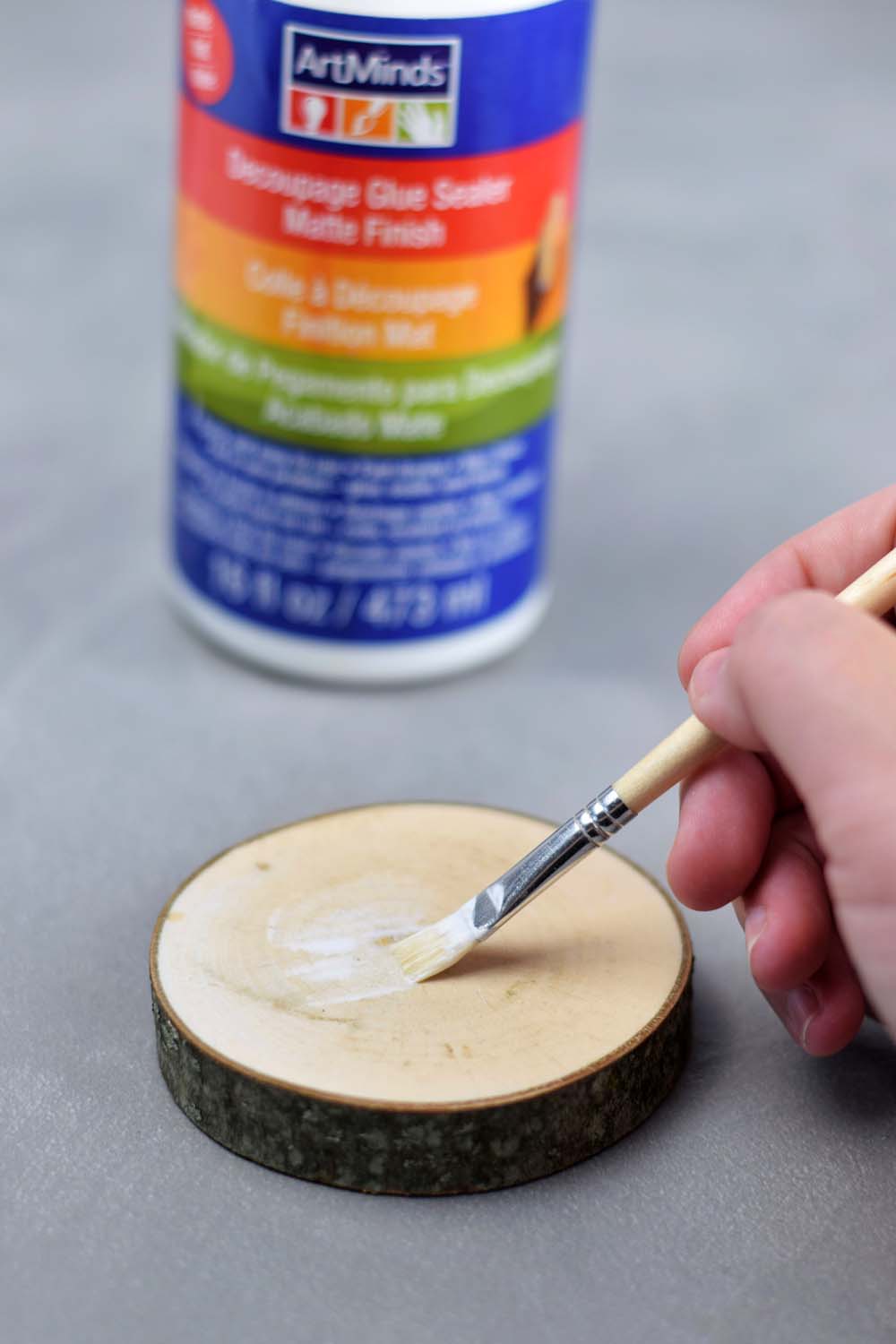 Use the Mod Podge sealant to attach the scrapbook to the wood slice. Paint a thin layer of the Mod Podge onto the wood slice. Place the paper circle on the wood slice.