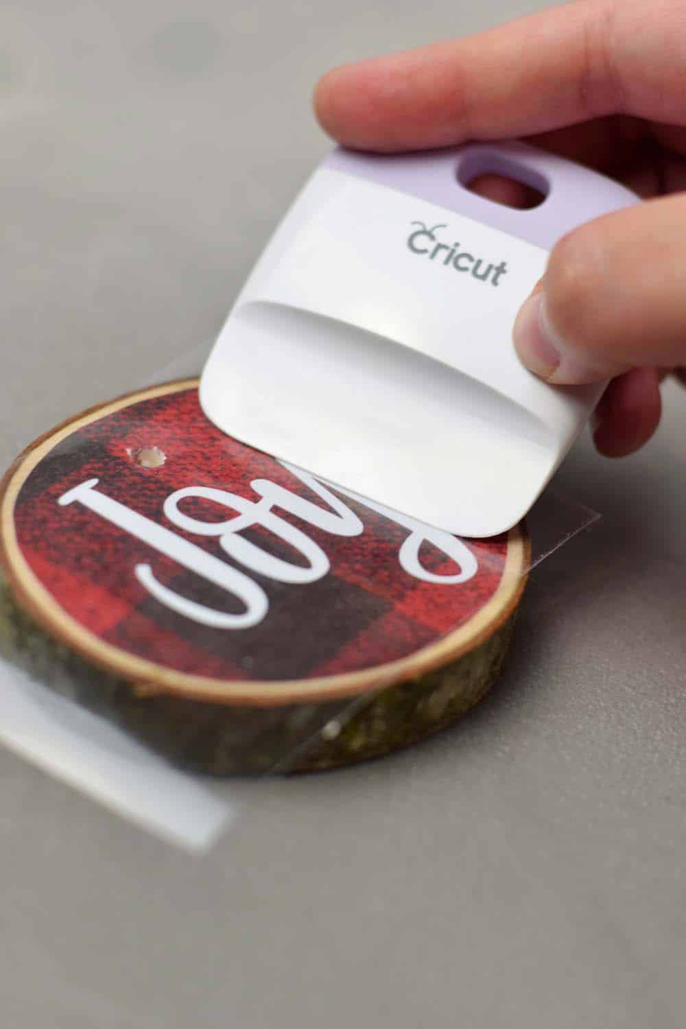The design is small enough to cut using a Cricut Express or Cricut Joy machine. You will find that each wood slice will vary in size. Make sure check the design size each time you cut for an ornament. Resize the design and then cut and weed the vinyl.