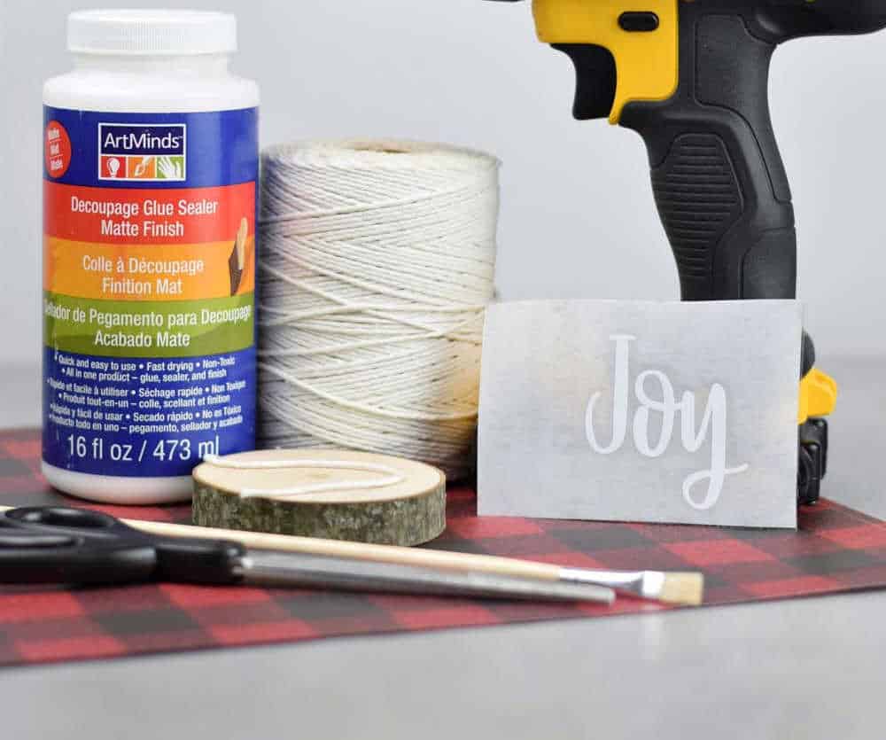 Make a wood slice Christmas ornament using a Cricut machine, craft wood slices, and mod podge.