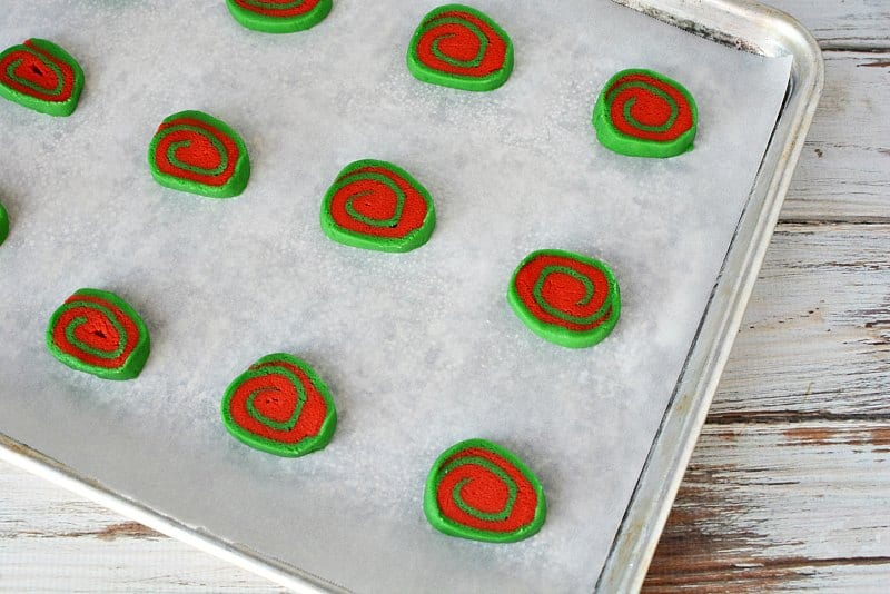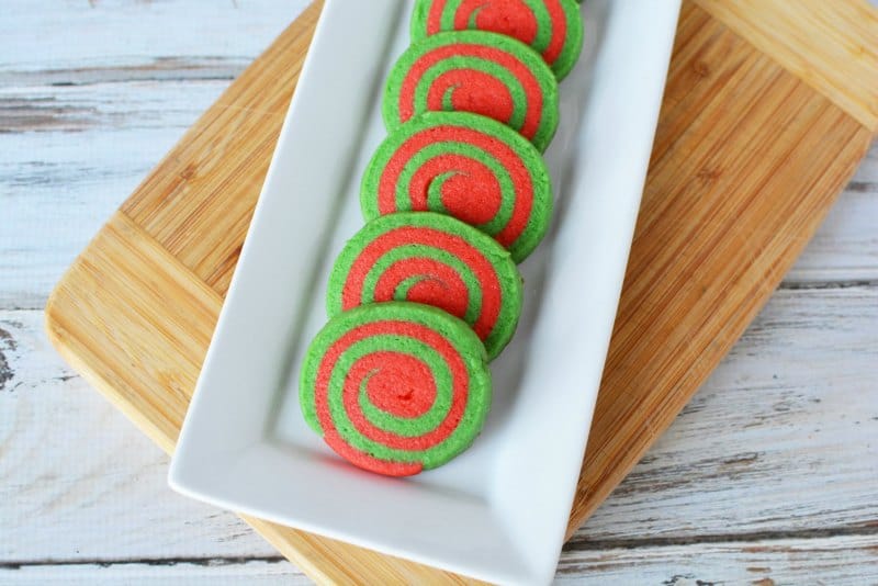 Festive red and green Christmas Pinwheel Cookies are fun and easy to make from a basic sugar cookie dough. Just roll, layer, slice and bake.