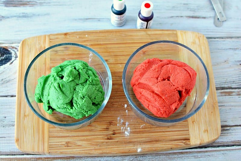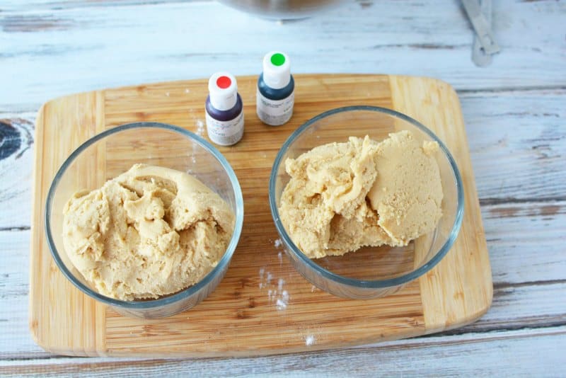 - Divide dough in half and remove half from the large mixing bowl. Add green coloring and beat until evenly colored.