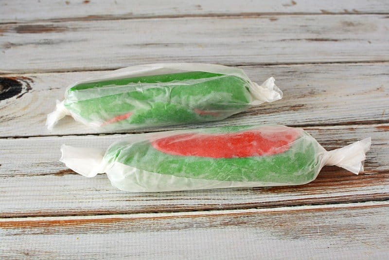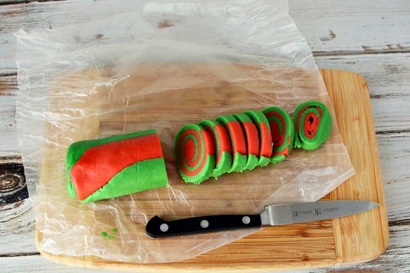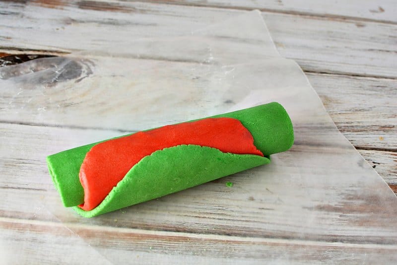 - Remove dough from the refrigerator and place a red on top of a green dough and gently begin to roll from the short end to create a log. Repeat so you have two logs. Wrap in wax paper and return to the refrigerator for an hour.