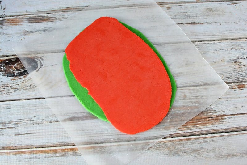 After 15 minutes, remove dough from the refrigerator and place a red on top of a green dough.