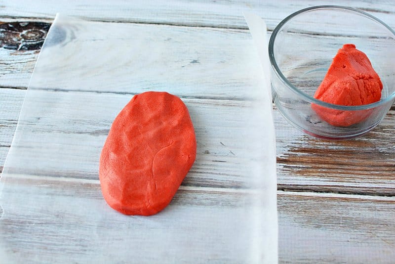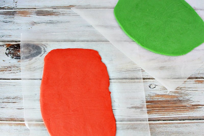 Once each half of the dough is the color you like, divide each of the colored doughs in half again. Put each 1/4 of the dough on it’s own wax paper sheet.b Roll each part (2 red and 2 green) flat between 2 pieces of wax paper about 1/4″ thick into a 9 x 6 rectangle size.