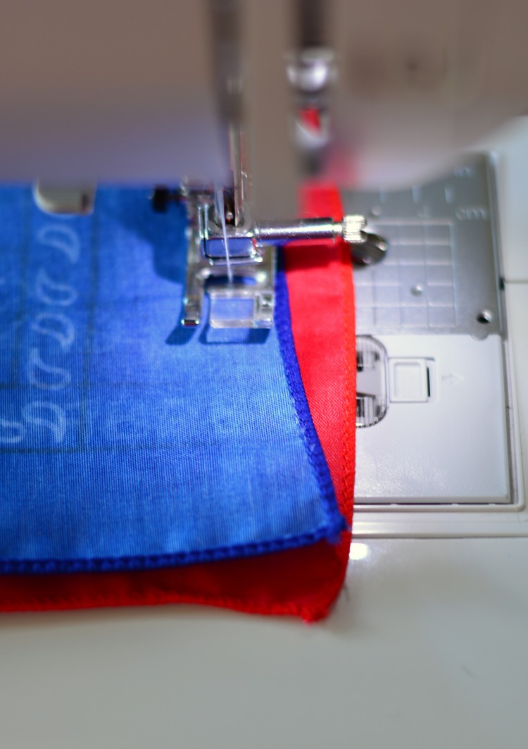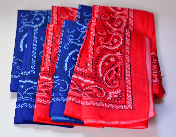 While at the dollar store one day, I noticed they had blue and red bandanas in a 2 pack for $1 – obviously. Hey! I figured I could whip up my bandana tablecloth for about $3-$4. However the dollar store only had red and blue but I found lots of fun colors on Amazon! I have a 70″ square table, which I love, but it is impossible to find a reasonably priced tablecloth for this table! I figured it was a bonus that I could just make one myself for so cheap. I ended up needing 9 bandannas total.