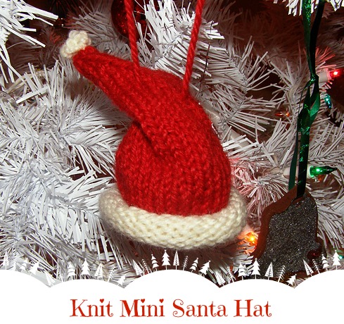 I used this mini Santa hat ornament pattern to make this little guy. It’s one of my favorites. Just use whatever red and white yarn scraps you have and any size needle. Or you could make different colored ones, too!