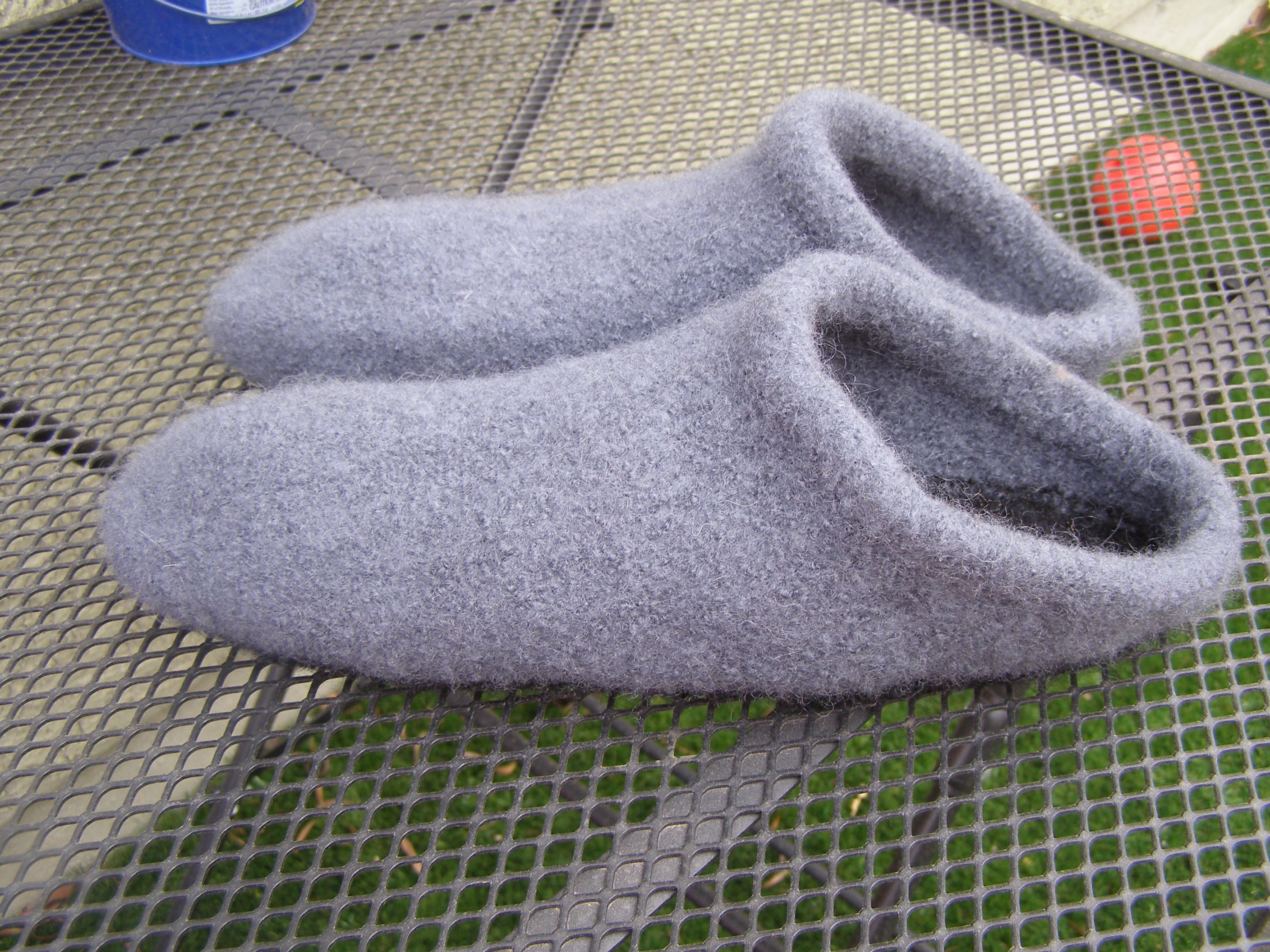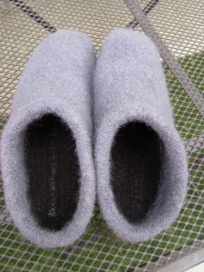 I found a lot of interesting items in those bins like some nice yarn I’d forgotten about! I also found several knitting projects that are just a few rows short of being finished. I’m not sure what I was thinking not finishing them. Amongst the rubble I discovered a pair of felted clogs I started about 3-4 years ago for my husband’s Christmas gift (oops). I spent maybe an hour finishing these and 20 minutes of that was felting them in the washing machine. From what I can recall of the pattern, it’s pretty simple even though it looks complicated on paper. I was a fairly new knitter when I made these so they aren’t difficult at all.