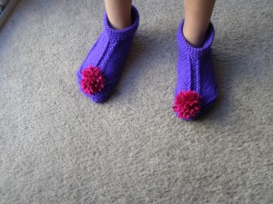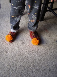 I then decided that I needed to knit my two youngest children slippers. I never knit the two little ones anything, mostly because I know they won’t appreciate or wear it. (I gave Sarah a pair of fingerless mitts made out of very nice handspun yarn over Thanksgiving.) I was mostly right about that. They actually love their slippers (they call them their “Elf Shoes”) and Miles does wear his. Ella’s slippers, however, are knit out of a too soft yarn (Caron Simply Soft) and wont’ stay up. I recommend a nice stiff wool for these. The pattern is the Two Needle Slipper, which is a staple in slipper making and for good reason. These knit up super fast! I had my doubts using worsted weight and a size 5 needle, but I could finish one slipper in about an hour. Ella is a size 13 or so shoe and I used the child size for her. Miles wears a size 9 toddler and I decreased the cast on and all other counts by 10 stitches (cast on 66 and decreased down to 30 stitches) but kept everything else the same and they are perfect for him.