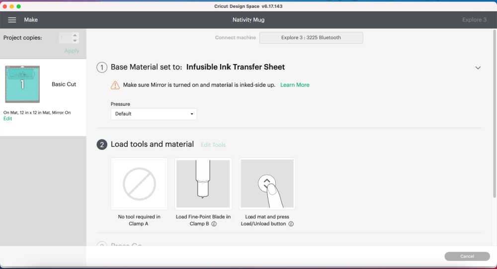 Put the transfer sheet with the infusible ink side facing up on a Light Grip cutting mat and follow the directions on the machine to cut. We used a standard grip mat on the blue mug, and it worked fine, but the light grip is much better for the Infusible Ink Sheets.