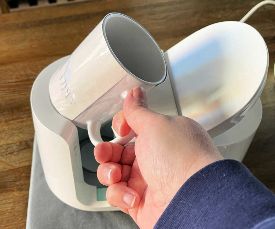 Once the mug is done, the press will beep to let you know. Open the press and carefully remove the mug. Place it on a heat-proof surface to cool. Allow it to cool before attempting to remove the transfer sheet. The mug will be very, very hot!