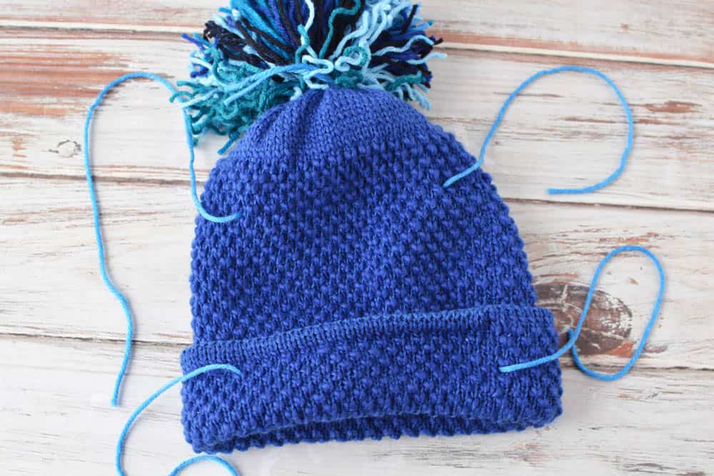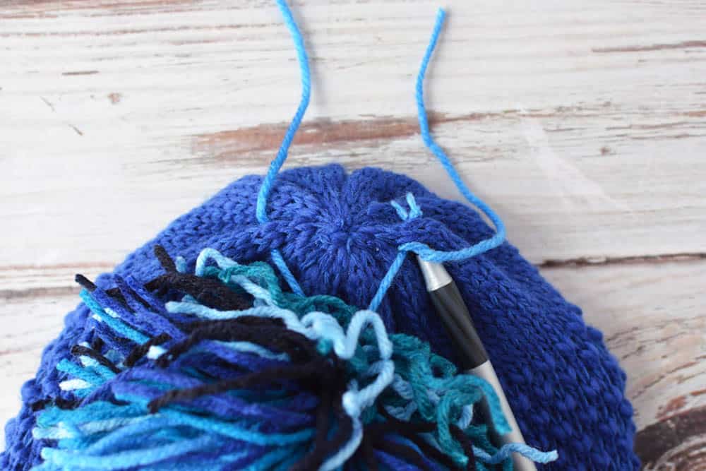 - .Thread the ends of the pom onto the top of the hat. Do this by sticking the yarn and a pen through the knit hat. You could also use a large sewing needle or crochet hook. Secure with a knot.