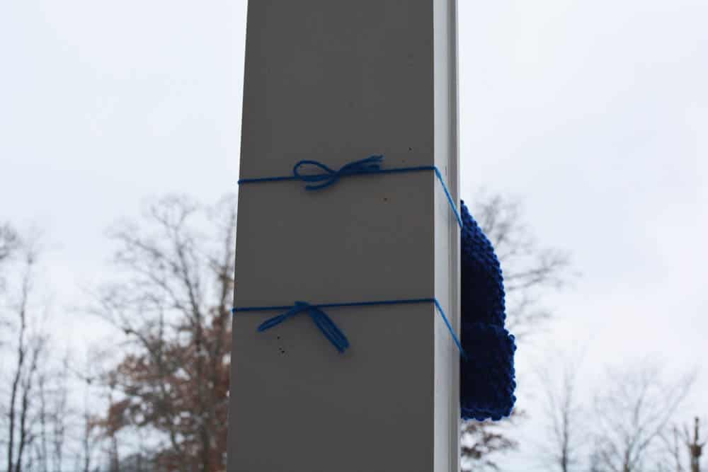 - These pieces are used to attach the hat to the post. Attach the hat to the post by tying the two pieces of yarn around the post and securing with a bow or knot.