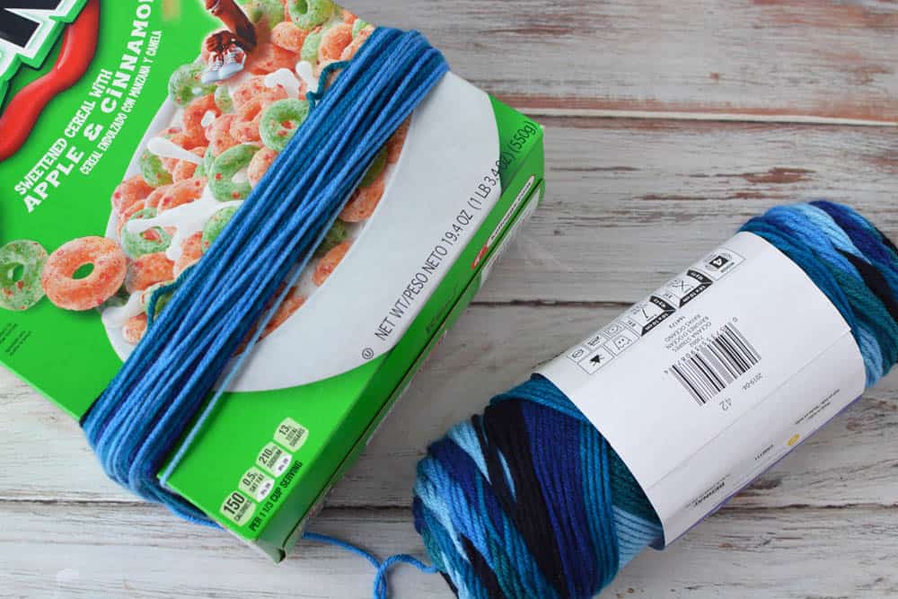 Now, make a pom-pom for the hat, if you want one for the hat. If you don’t want a pom-pom you can skip this step. Wrap the yarn around a cereal box about 75 times. Remove from box by carefully sliding off.