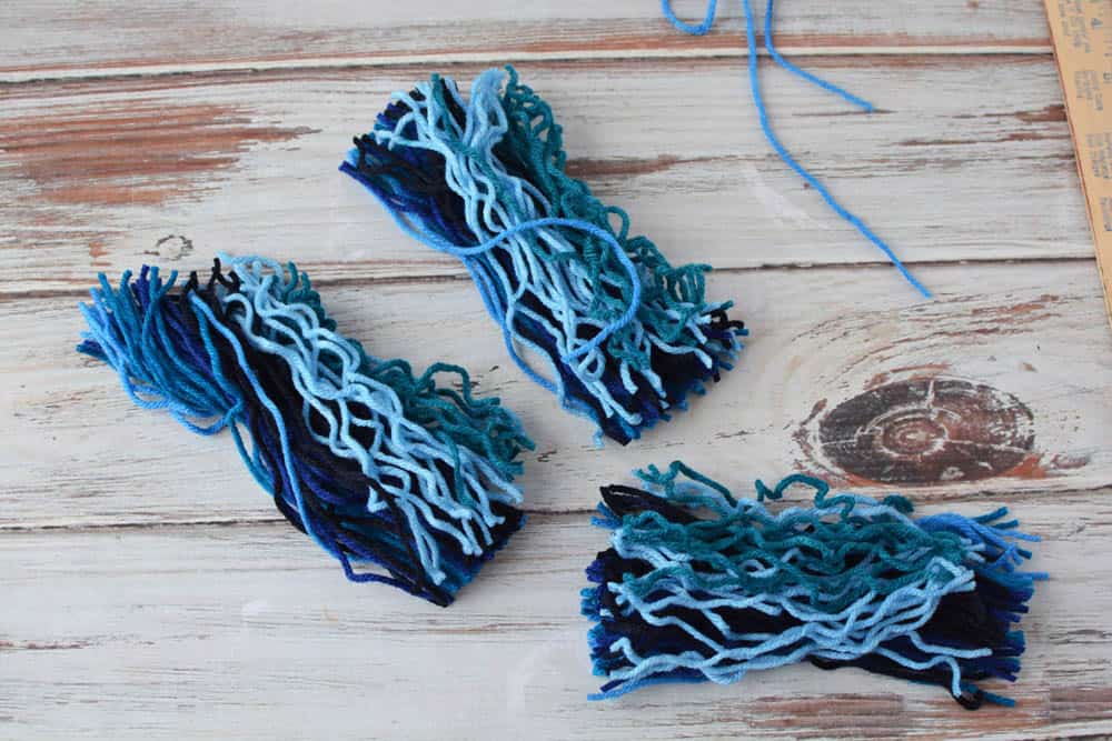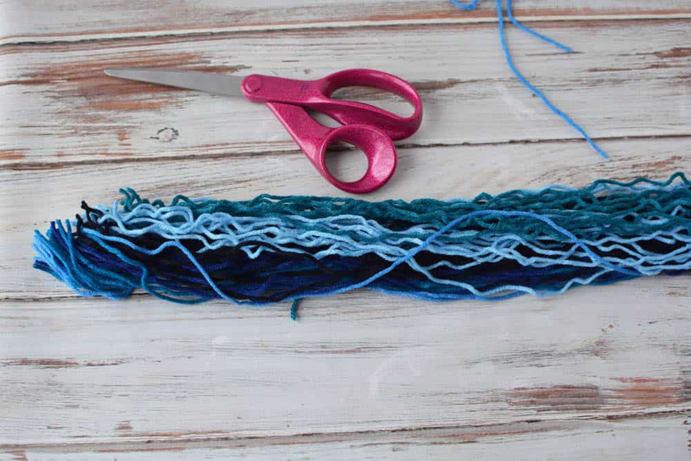 - Cut the yarn in half. It should be about 18″ long when cut.