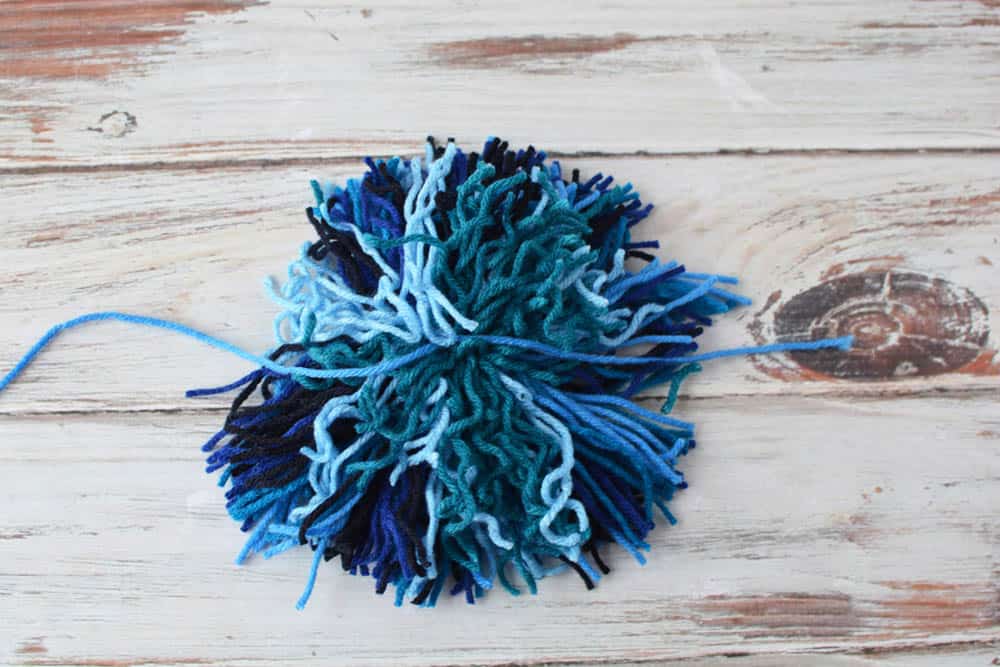 Tie a piece of yarn around the center and tightly double knot to create a pom-pom. Trim as desired.