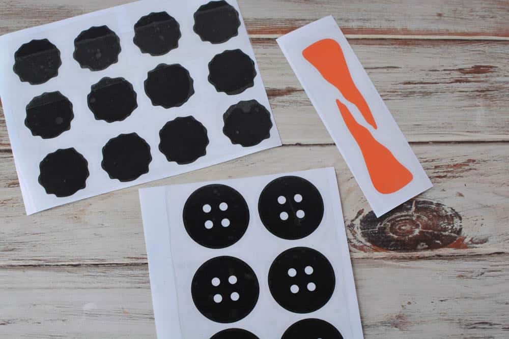 Cut out thee eyes, nose, mouth, and buttons using a Cricut Explore Air 2. If you are new to the Circut, check out our A Beginner Guide to Crafting with the Cricut Explore Air 2 for tips on cutting. These decorations are meant to be removable. So for the vinyl pieces, you want to use removable vinyl in black and orange. You can make the buttons and face in any color, of course.