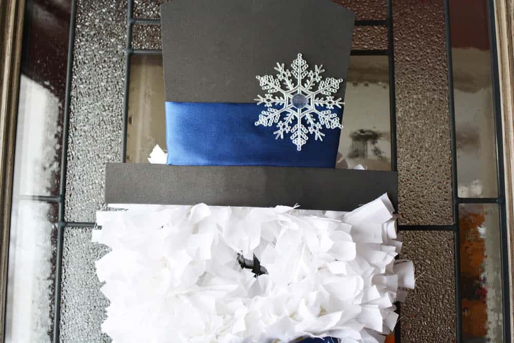 - Hang the wreath on your wall or door and place the hat on the top. Once you figure out where you want the hat on the snowman, hot glue it onto the snowman’s head where you want it. Tuck in any loose white ends from the fabric or trim as desired.