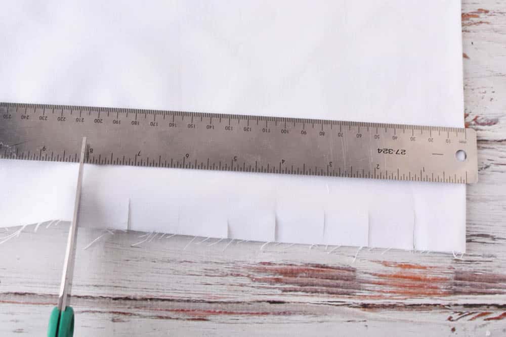 - Cut the white fabric into strips 7″ wide by 1″ thick.