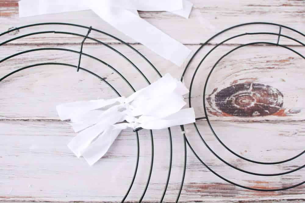Tie the strips on both of the wreath forms until completely covered. You can start wherever you like. We like to start on the inside and work outside.