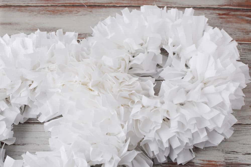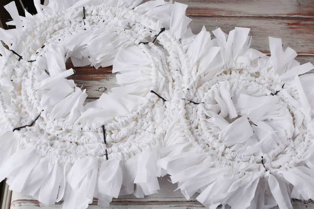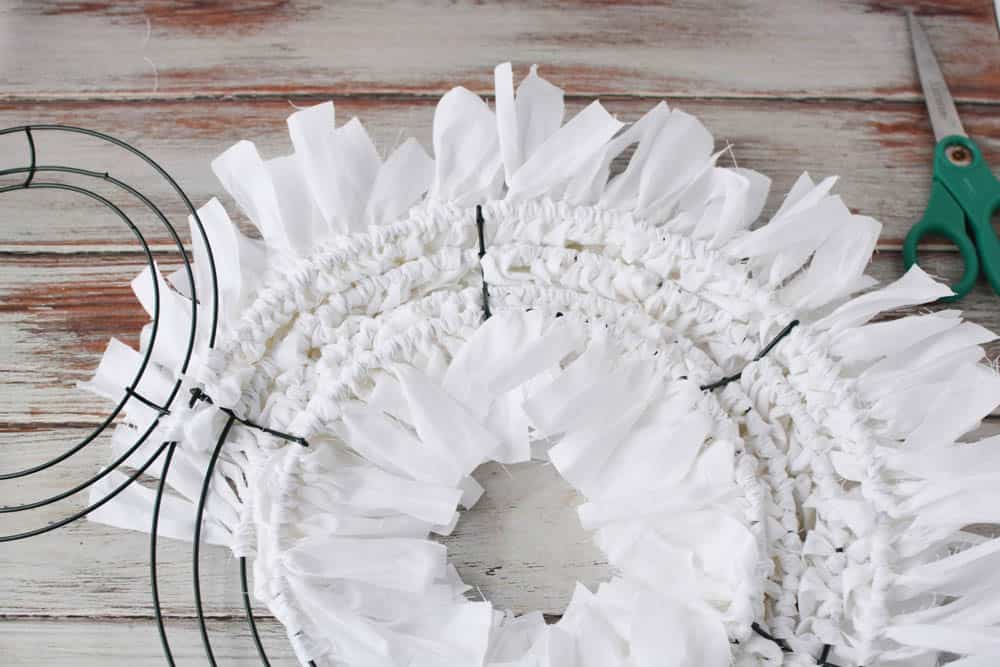 - Once you have all the fabric on the wreath forms, take the wreath outside and shake all of the frayed ends off of it.