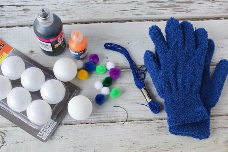Make a DIY snowman craft ornament using fuzzy gloves, ping pong balls, and a few basic craft supplies.