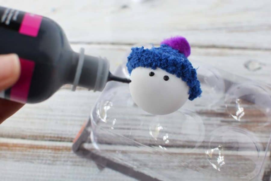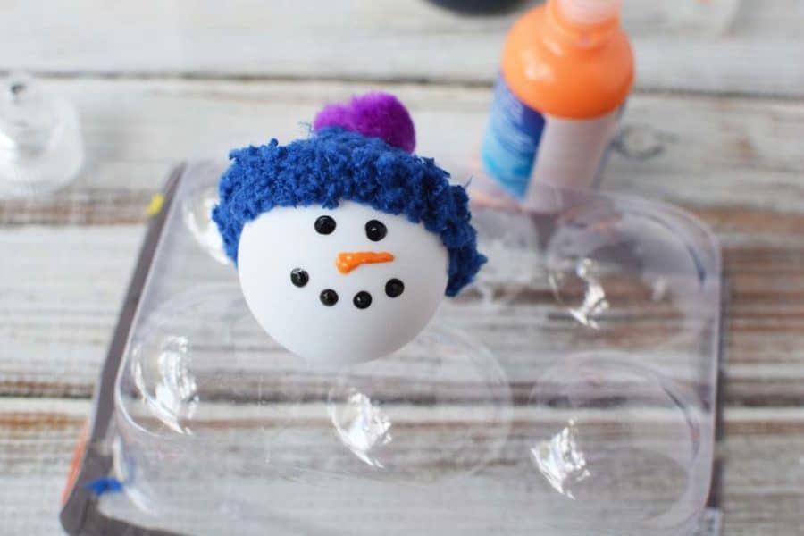 - Add an orange nose with puffy paint and let dry completely by setting the ball on an egg carton. Keep the ball level/parallel to the table the egg carton sits on. Then leave on the carton to dry completely.