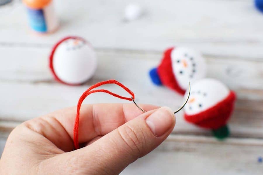 - Once the paint is dry, add the hanger. Thread embroidery floss through an upholstery needle and thread the needle through the top of the hat.