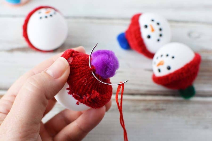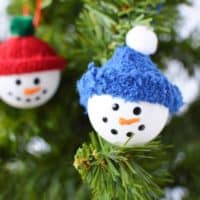 Turn plain white ping pong balls and the fingers from fuzzy gloves into snowman ornaments for your Christmas tree. Paint a snowman face on the ping pong balls. Then follow an easy tutorial on cutting and sewing little snowman hats using a winter glove. This is a great way to recycle gloves that have lost their mate! Glue the hat to the top of the ping pong ball. Tiny pom poms are added to the top of the hats. The ornaments are then hung on the Christmas tree using embroidery thread attached to the hats.