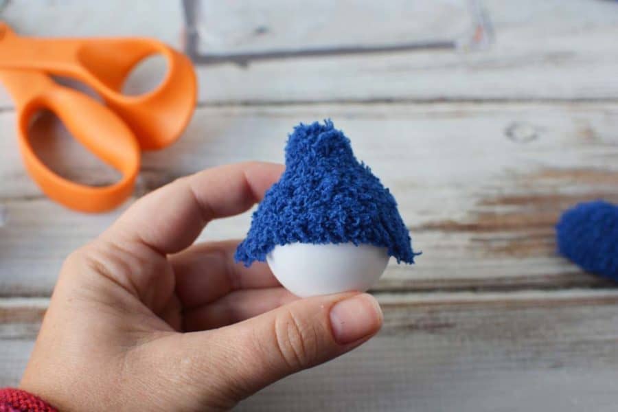 Cut the finger vertically, about 1″ from the bottom with scissors. You just want to open up the back so you can pull it over the ping pong ball to make a hat. Don’t cut it completely open.