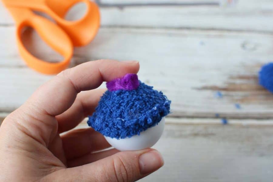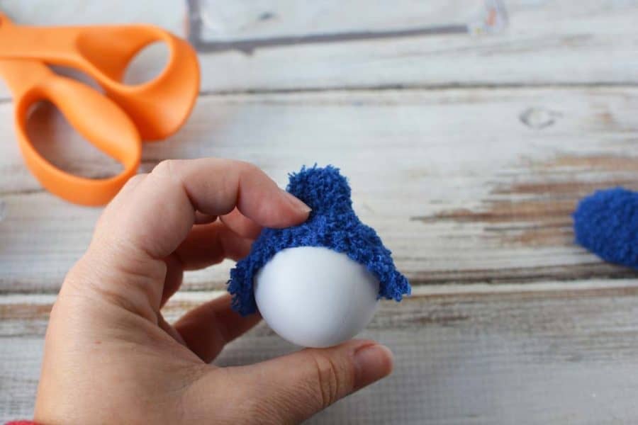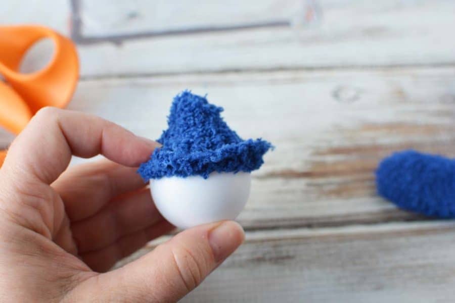 Wrap the finger of the glove around the ping pong ball. The back of the hat will have the split you cut. You’ll need to stretch it over the ball to fit.