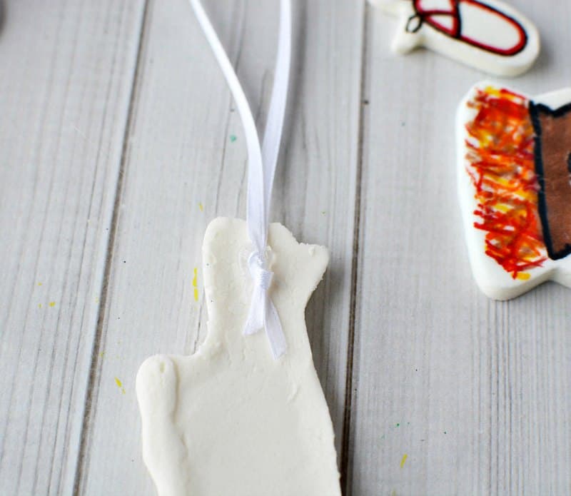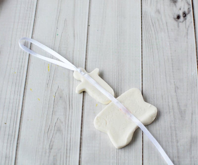 Once your ornaments are decorated, add a ribbon to hang them. Cut about an 8″ piece of ribbon and tie the ends in a knot.