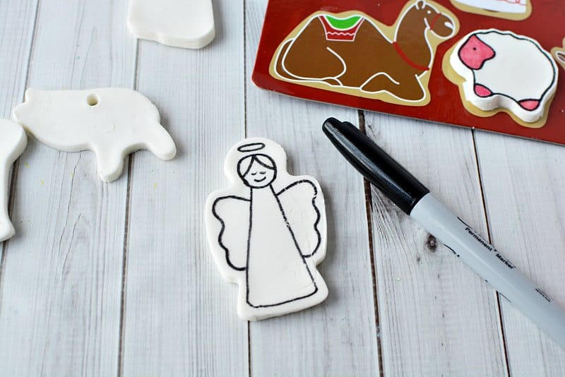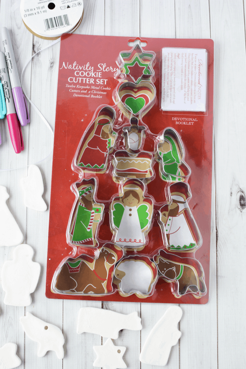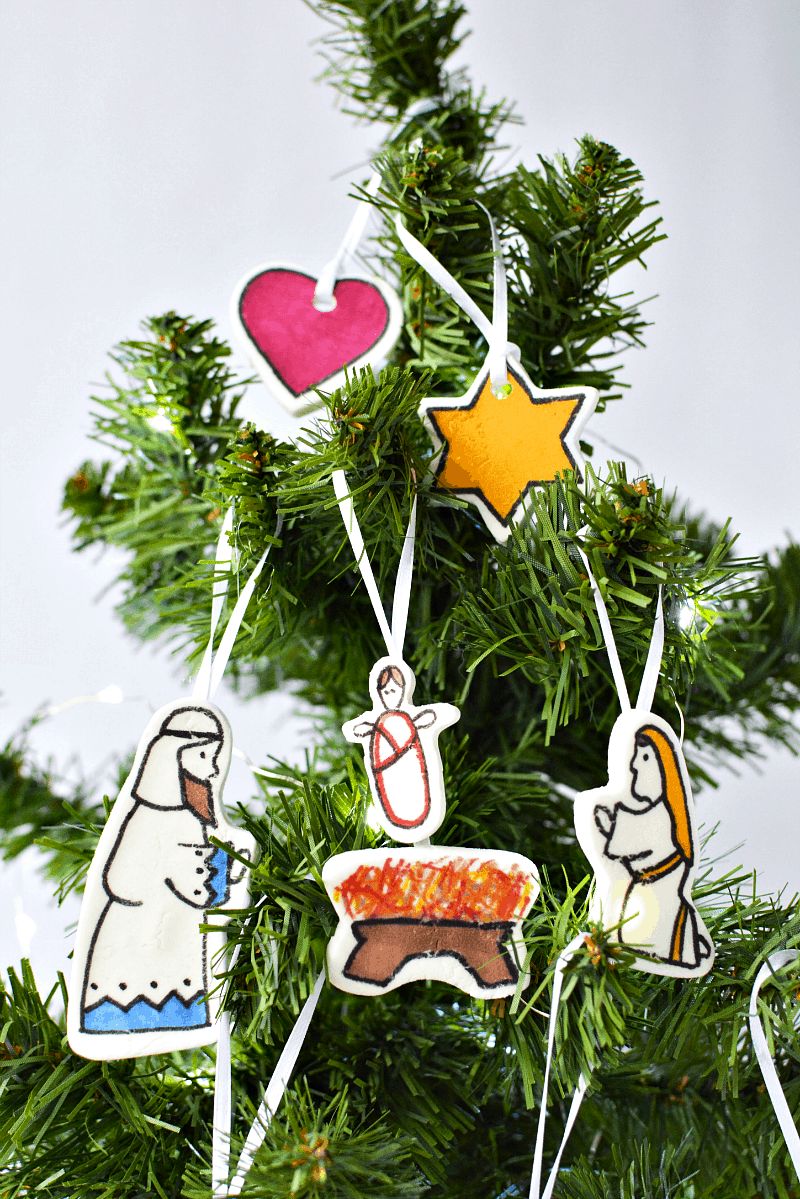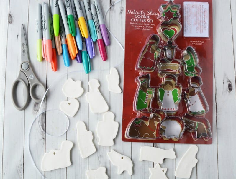 Make homemade DIY nativity Christmas ornaments with baking soda dough, cookie cutters, and markers.