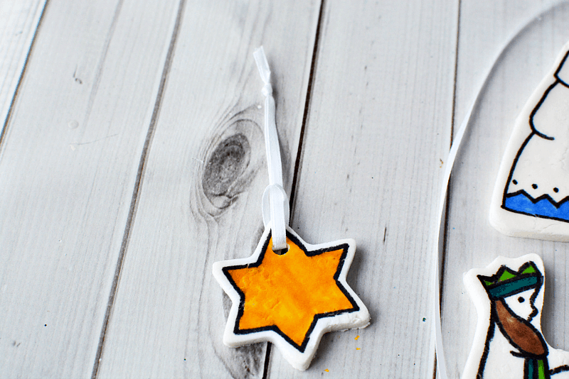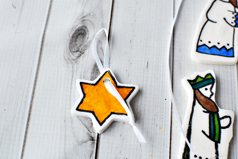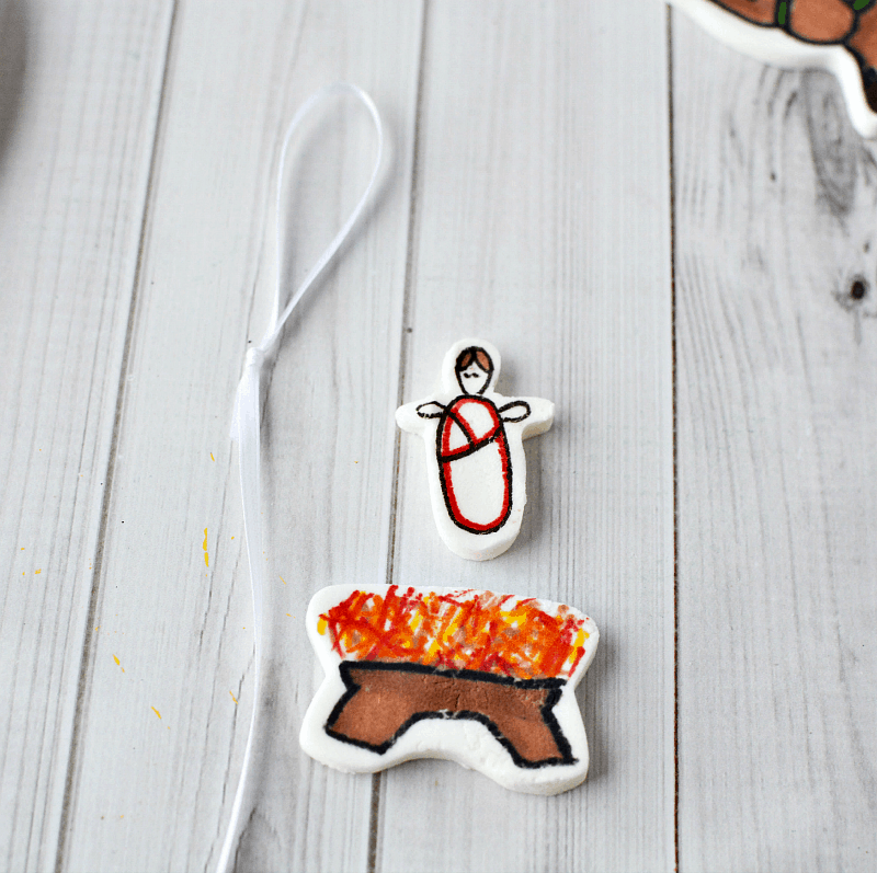 DIY nativity Christmas ornaments to make with baking soda dough, cookie cutters, and markers.