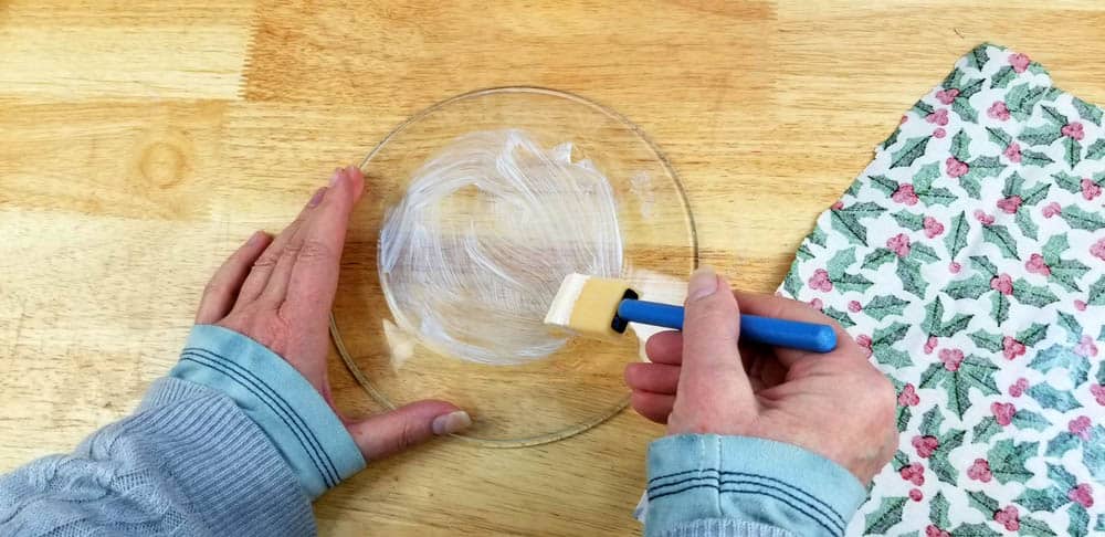 - Using the foam brush to spread the Mod Podge onto the back of the plate.
