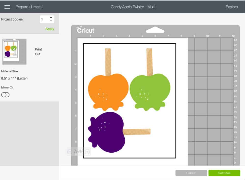 Open Cricut Design Space and either upload the candy apple clip art to the program or use our pre-made projects by clicking on the links in the email. Once the design is in your Design Space, hit the “Make It” button. You will first print the template on cardstock from your printer.