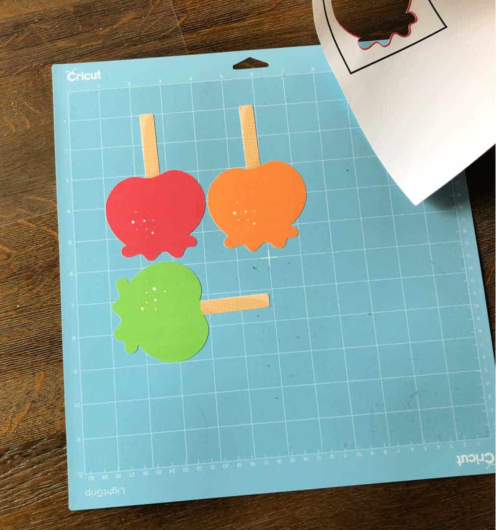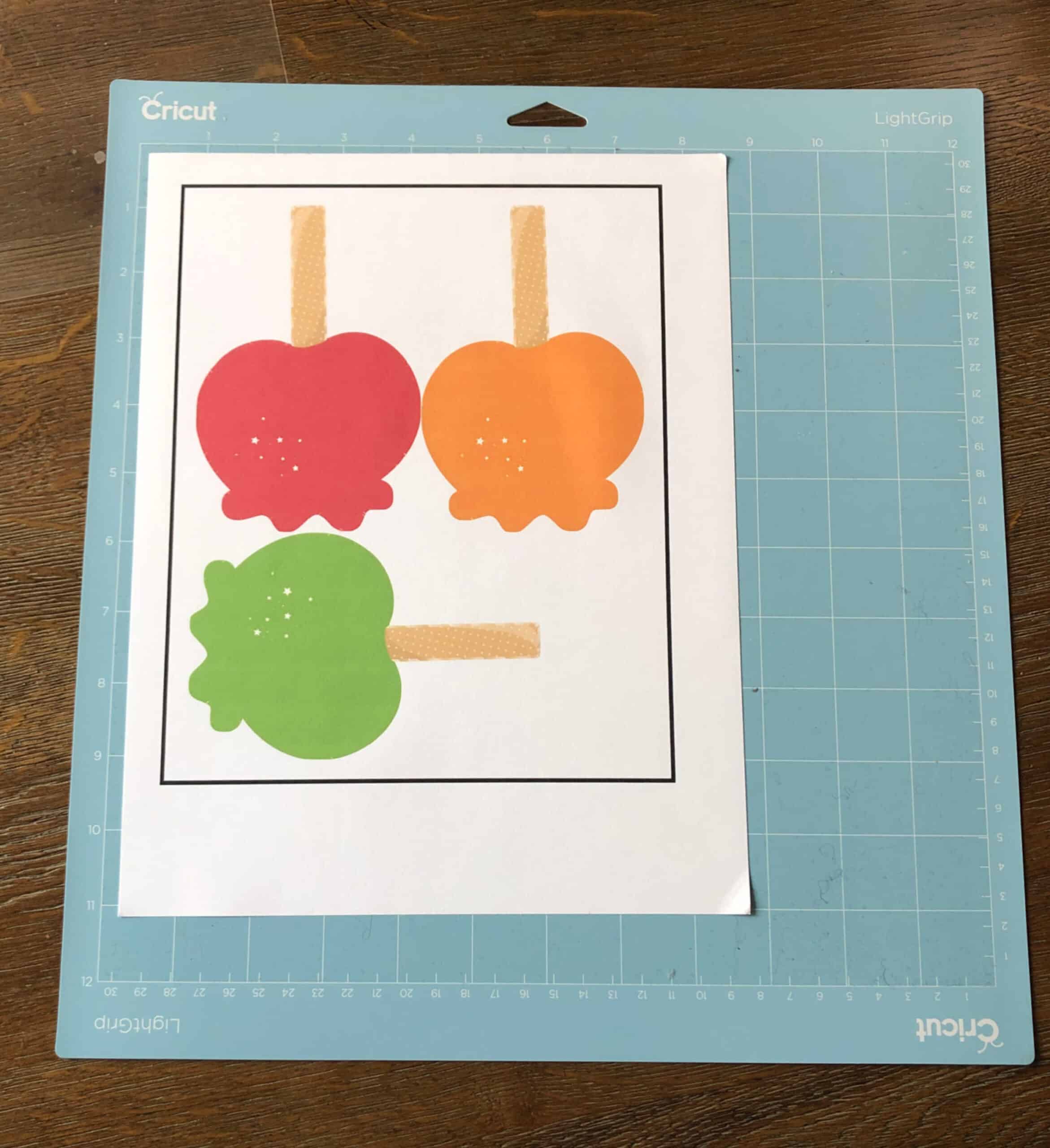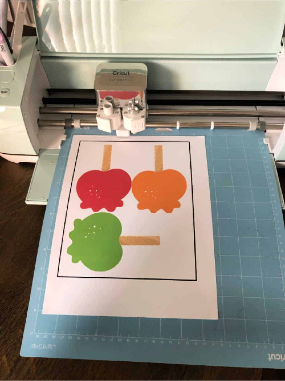 To cut the apples out on the Cricut, you will use the “Print and Cut” method. After some trial and error, we found that you can cut out 3 apples on 1 sheet of cardstock. Since you need 16 total apples, you will end up with one single apple on the last sheet. When you sign up for our newsletter, we will send you the links to the apples in Cricut Design Space.