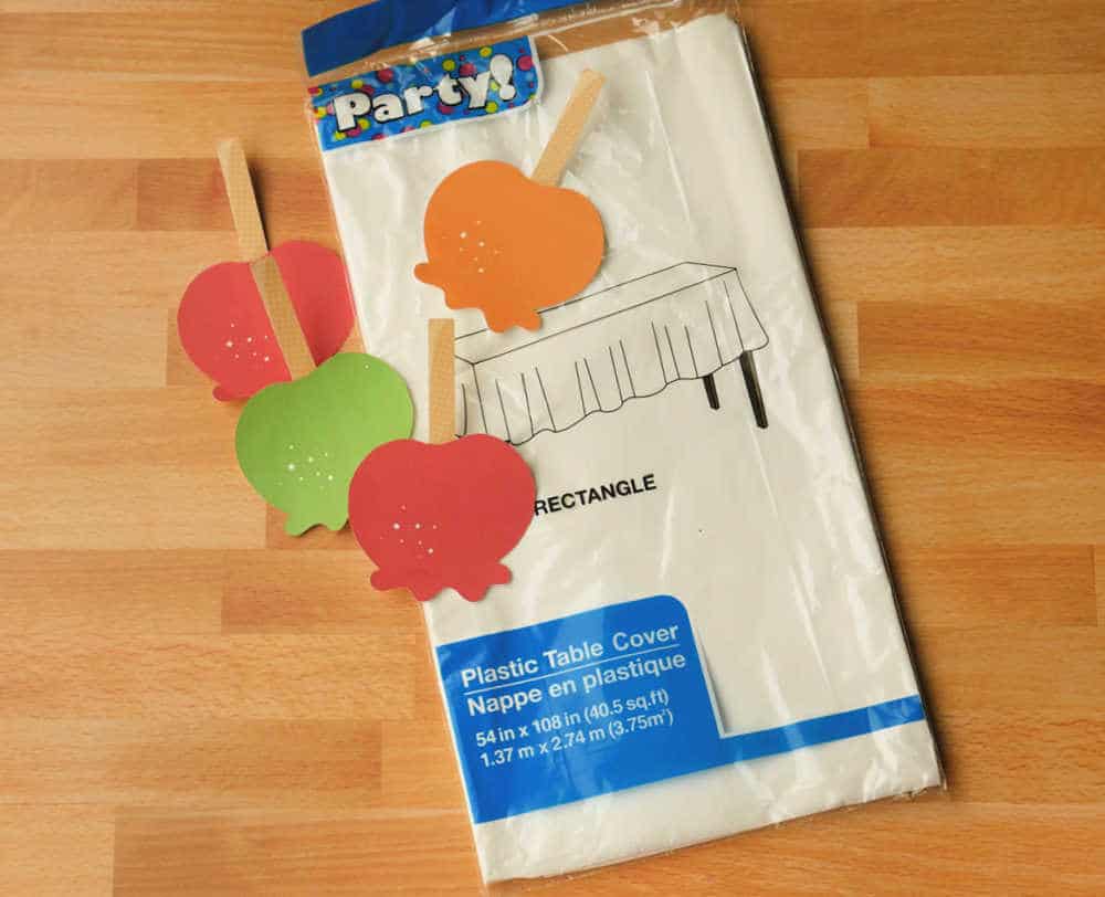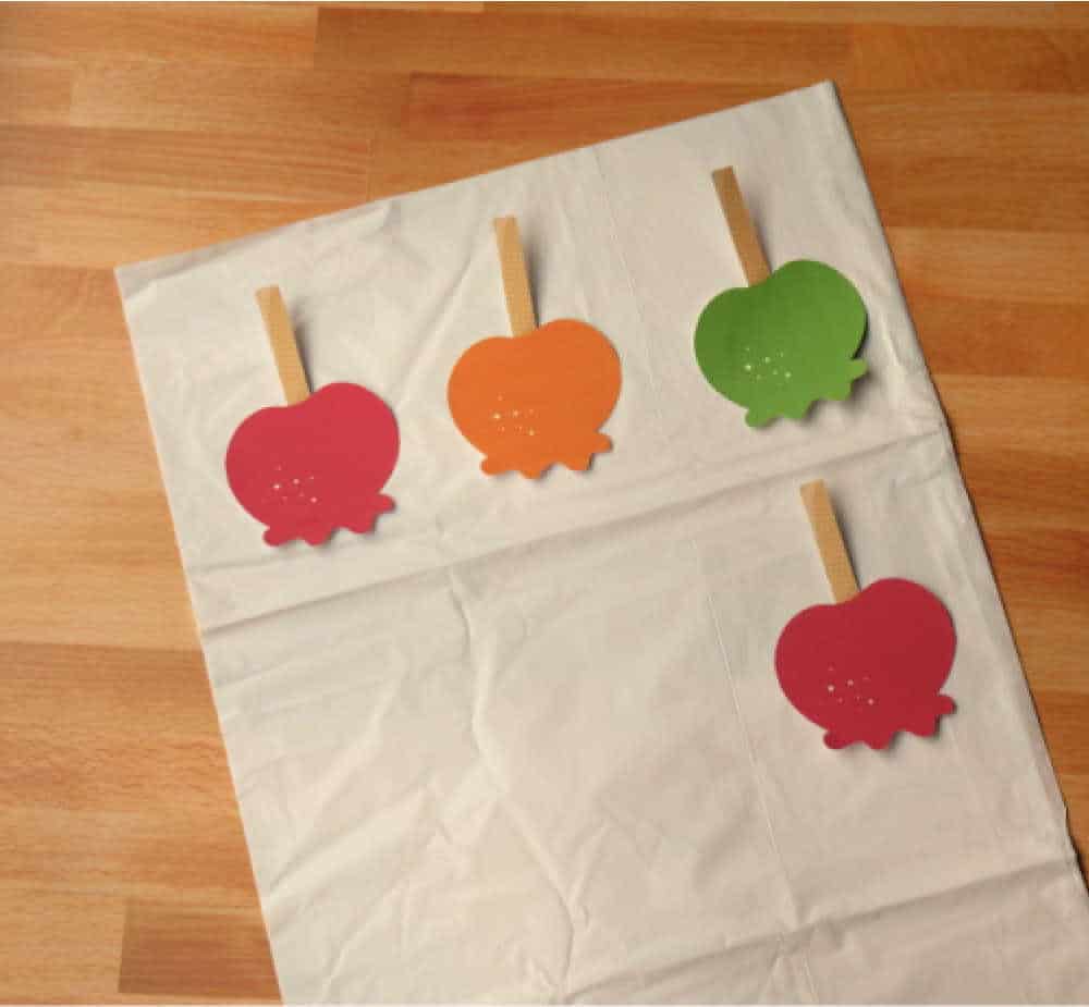 If you’d prefer to have a game board that can be moved easily, you can glue or tape the apples onto a plastic tablecloth in a twister layout. Just fold and move to play.
