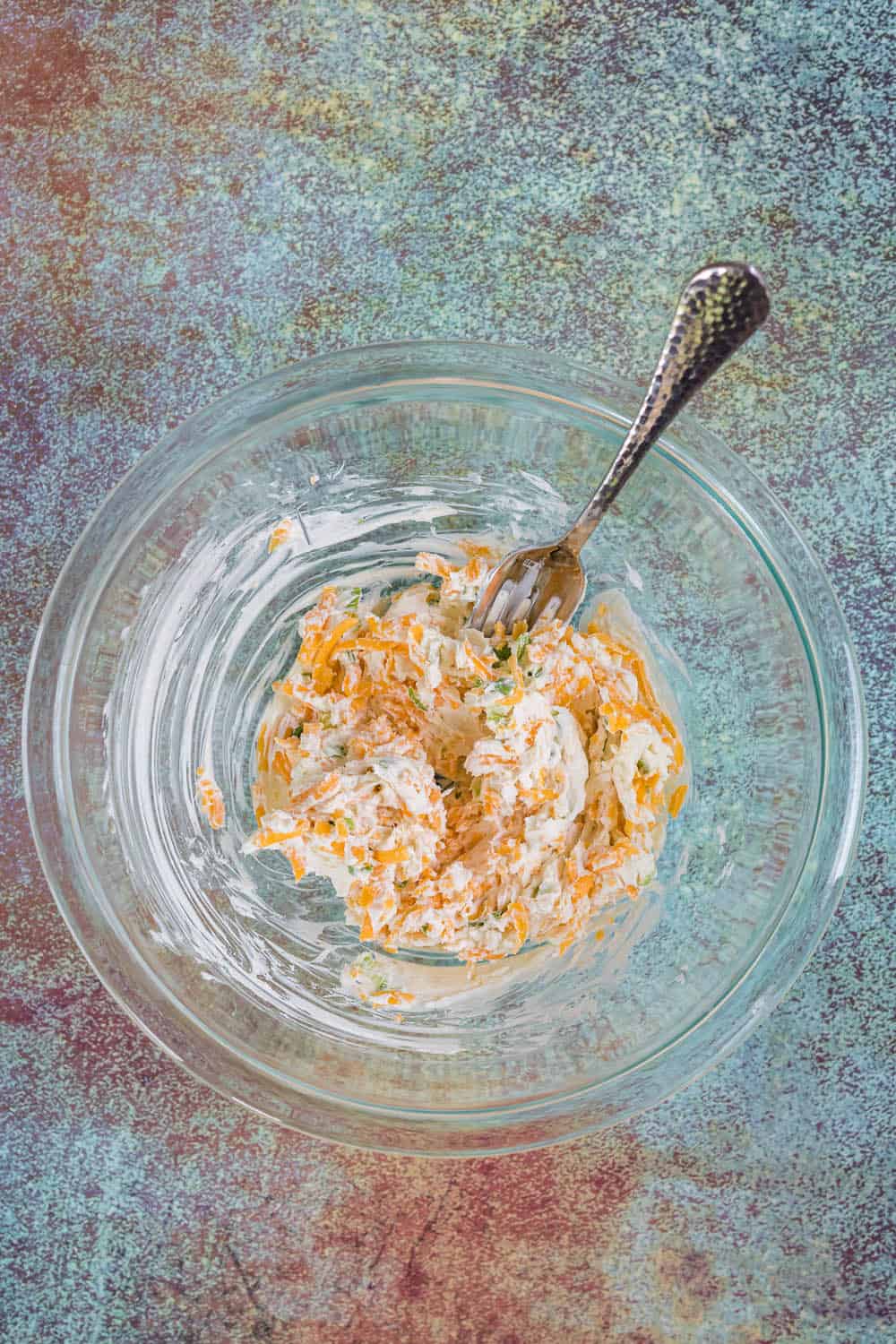 - Mix the cheddar cheese with the cream cheese mixture.