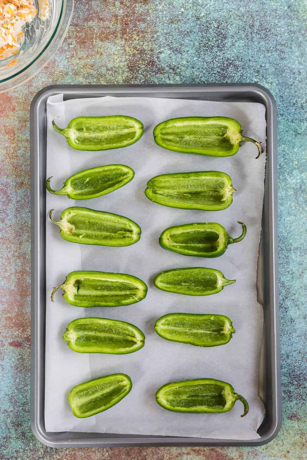 Cut the jalapenos in half lengthwise. Remove the pepper seeds and ribs from each jalapeno half. A grapefruit spoon works great for this! Place the jalapeno halves onto a parchment-lined rimmed cookie sheet.