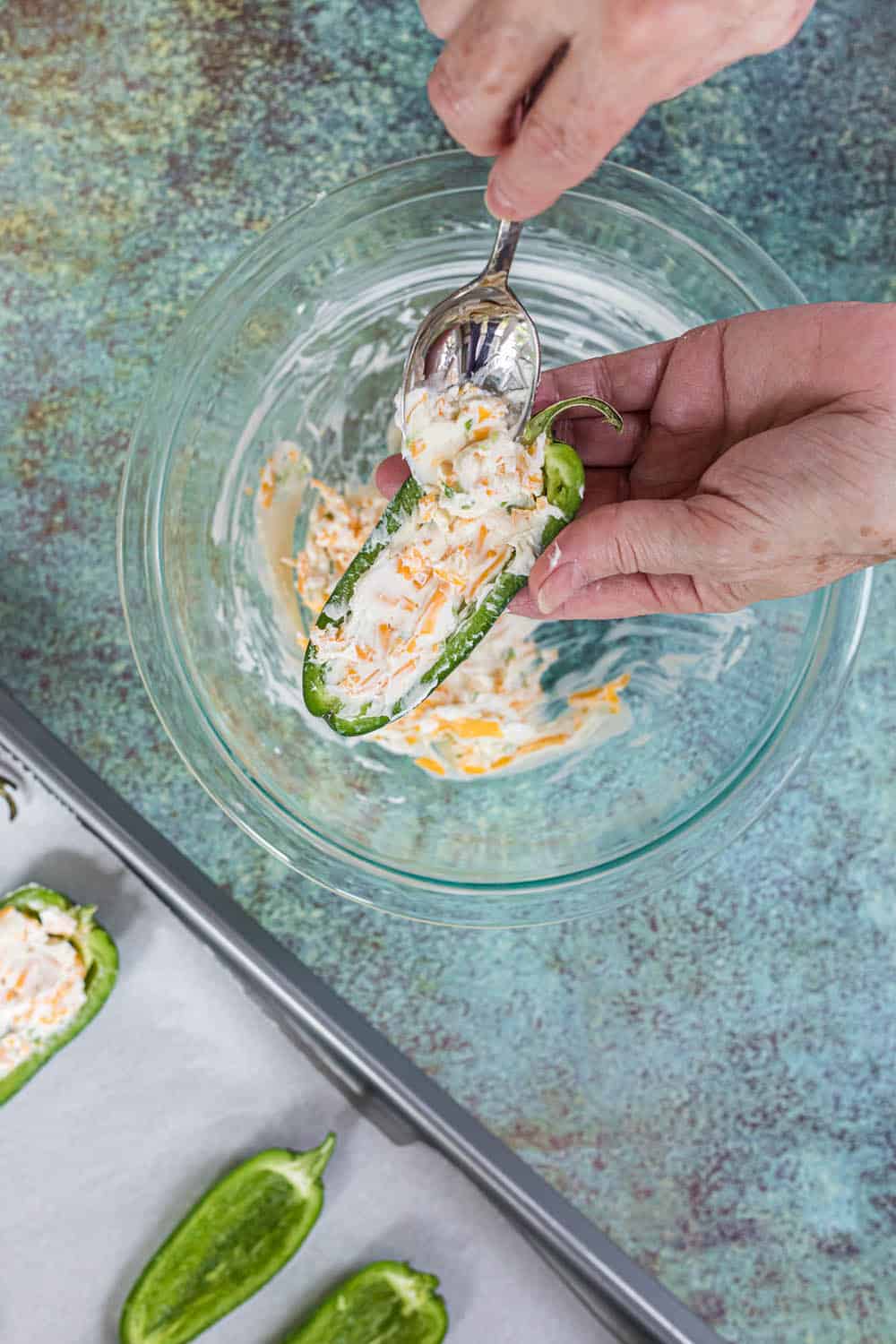 - Use a spoon to fill each jalapeño half with about 1 tablespoon cheese mixture. Don’t overfill.