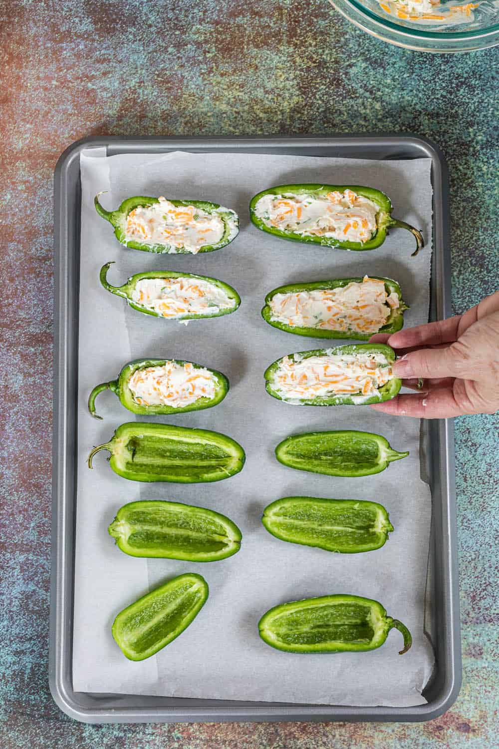 Fill each jalapeño half with about 1 tablespoon cheese mixture. Be careful not to overfill the peppers.