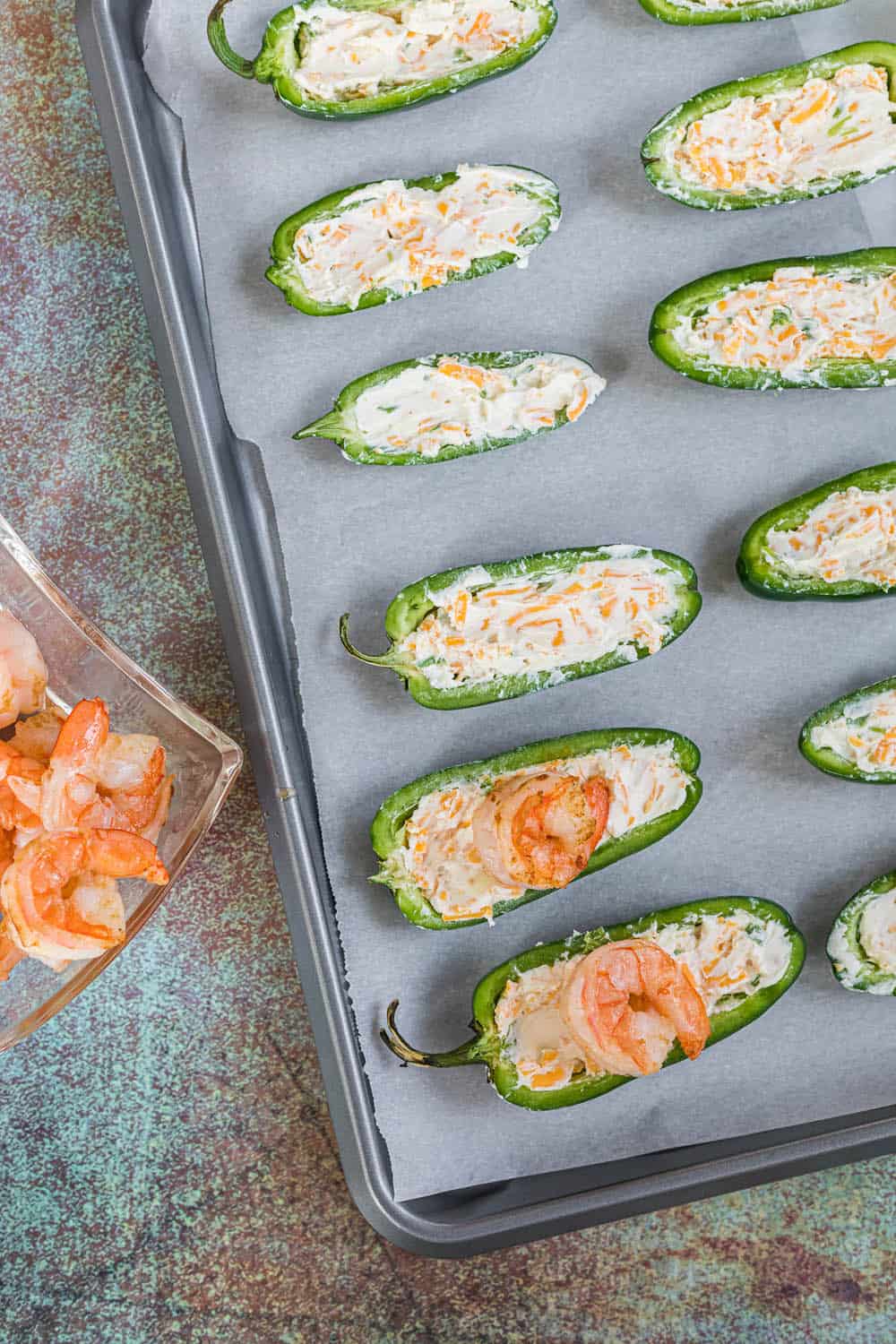 - Top each jalapeno half with a shrimp.