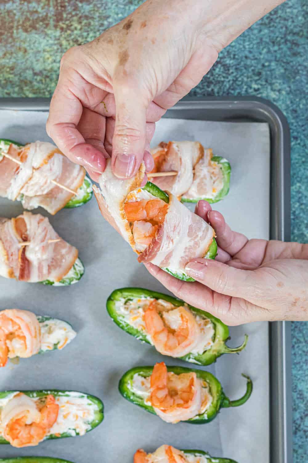 Once all the jalapenos are filled, top each half with a shrimp. If you don’t want shrimp on the poppers, skip this step and move to the bacon.